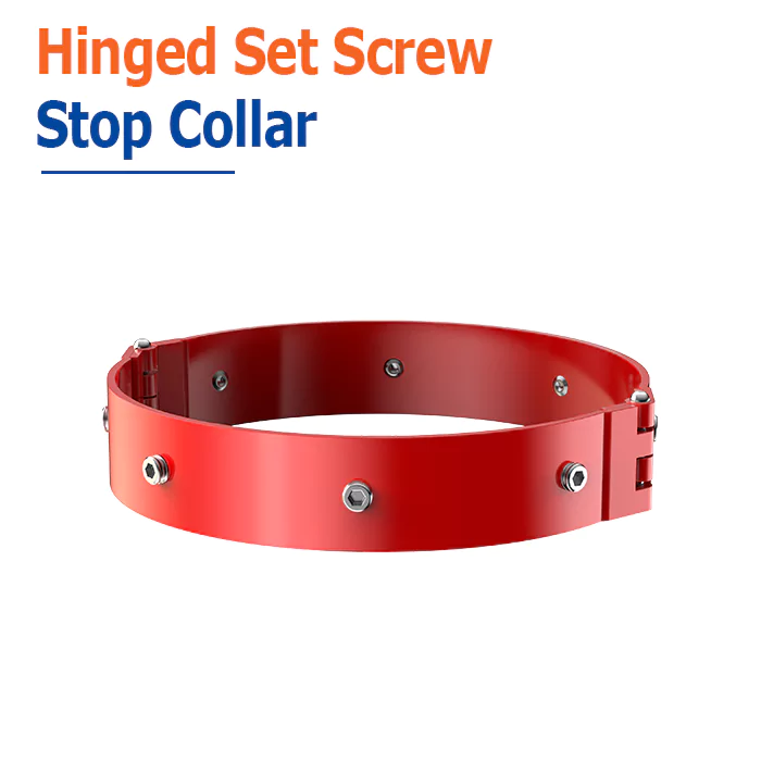 The two-piece, hinged design allows the collar to be opened and latched onto the casing pipe at any point along its length. This means installation is quick and does not require slipping the collar over the end of the casing joint. Once the collar is latched around the casing, it is secured by tightening one or more set screws (typically using an Allen wrench). The sharpened tip of the set screw penetrates the pipe’s outer surface, creating a positive mechanical lock or “bite” into the casing material.