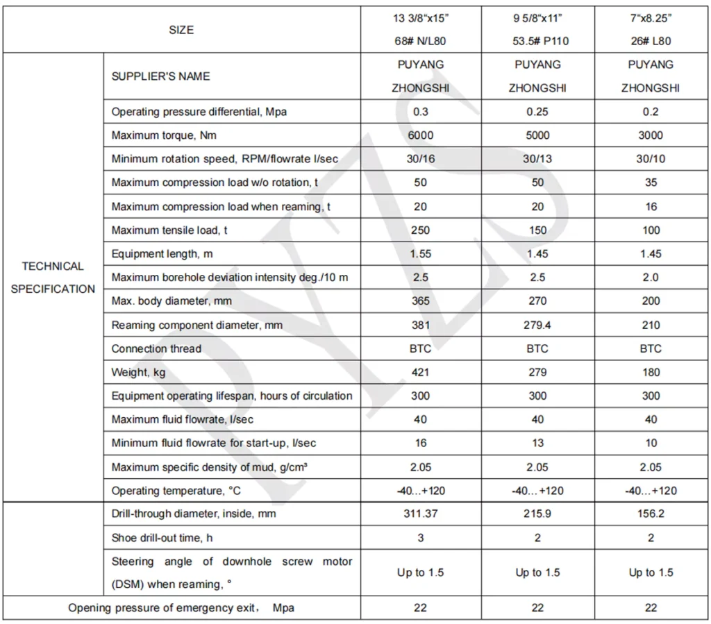 data sheet of hydraulic reamer shoe